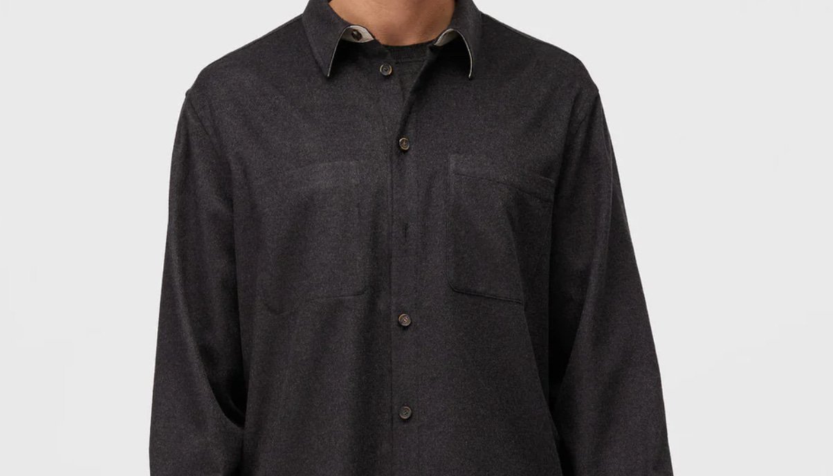From a distance, it appears simple: a deep charcoal overshirt, almost black, with double pockets.