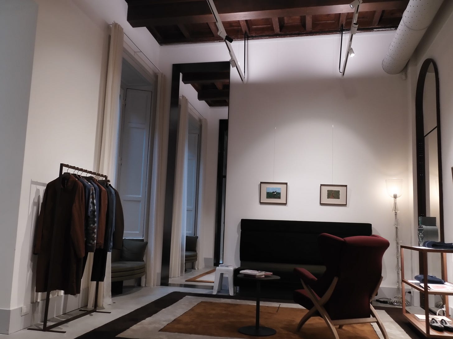 But as I walked through the space, observing each garment, touching the inner canvas of jackets and overcoats, feeling the fabrics — I found myself asking: